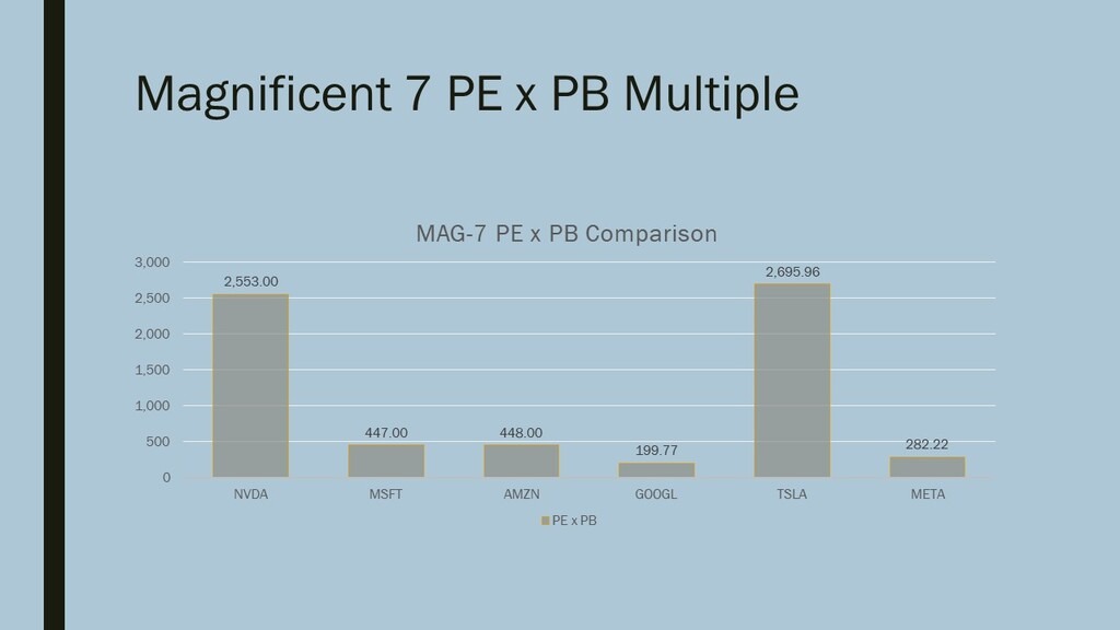 The “Magnificent PE x PB Comparison” chart shows that Tesla (TSLA) is the most overvalued stock due to its overvalued future-oriented growth. Nvidia (NVDA) follows closely at 2,553.00, driven by its explosive growth rate due to AI chips and GPU technologies. Technological-oriented companies like Amazon and Microsoft have moderately high valuations, with values of 448.00 and 447.00 respectively. Google and Meta have lower multiples, suggesting they have wealthy fundamentals but are not overvalued. The chart highlights the high-growth and technology-dependent nature of high-growth firms like Nvidia and Tesla.